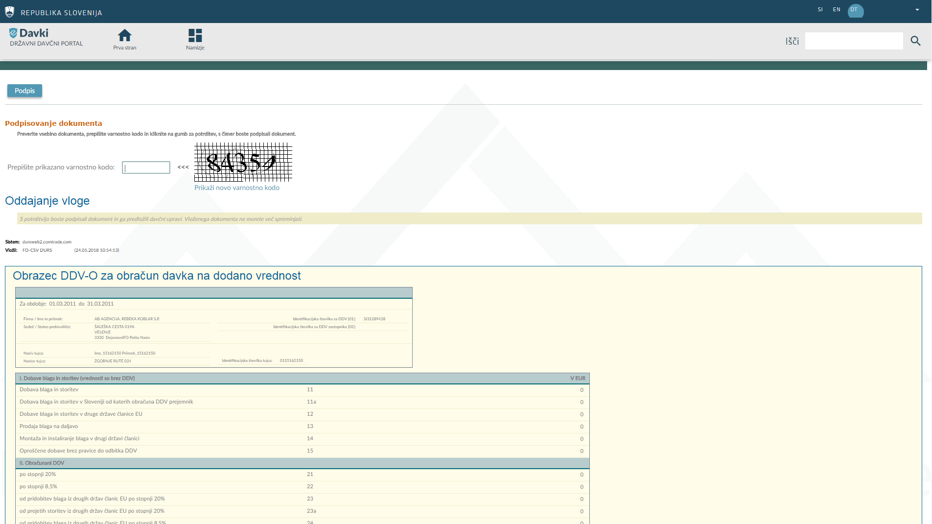 5. Nato morate dokument še podpisati. V polje zraven gumba Podpiši prepišite varnostno kodo s slike in kliknite Podpiši.